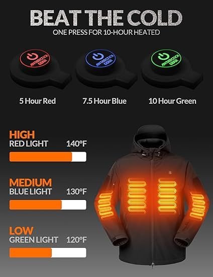 ��THREE HEATING LEVEL & DUAL CONTROL BUTTONS: 3 Heating levels (high, medium, and low). Change the heat setting of your jacket with a simple press of a button. Our battery can work up to 10 hours / 120℉ at a low level, 7.5 hours / 120℉ at a medium level, and 5 hours / 140℉ at a high level.