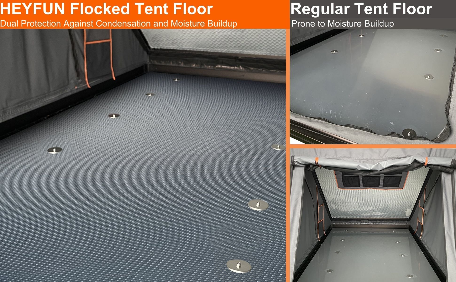 5.5 - Flocked Lining Tent Floor: Ugraded with flocked lining compared to others's tent, dual-layer protection against condensation and moisture buildup.