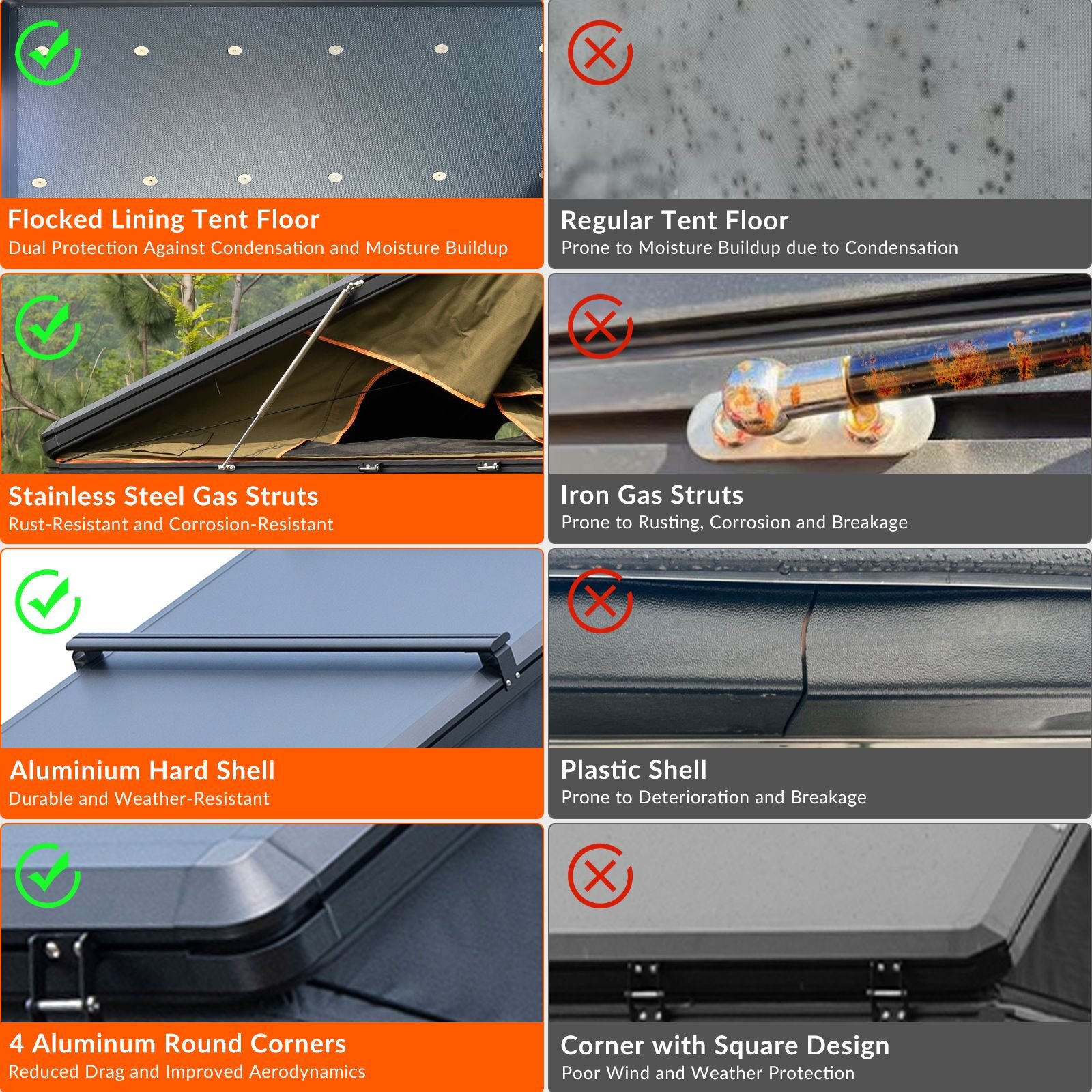 1. [Hardshell Rooftop Tent with Top Configuration 3 Layer Luxurious Mattress] - The suv car rooftop tent is designed with thick wear-resistant polyester, honeycomb aluminum hardshell with aluminium round corner, stainless steel gas struts, 3-layer built-in mattress, flocked lining tent floor, 13 interior ceiling&sidewall storage pouches and zipper netting windows, providing additional structural strength&rigidity, UV-resistant, waterproof, breathable and resistant to moisture.